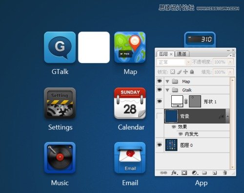 将原图层解锁成普通图层,置于图层最底处。其上是自己重新做好的背景图层,一般处于隐藏状态,只有当需要查看临摹好的图标在自己背景下效果时再打开。然后根据参照作品图标名称分别命名编组,并在其相应组内绘制,临摹图标时也尽量保证图标比例大小与原作一致。