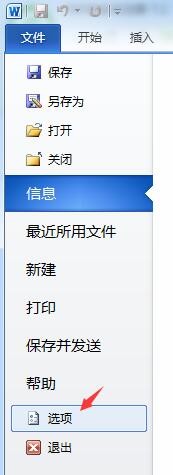 1、进入word2010,点击“文件”菜单中的“选项”,如图: