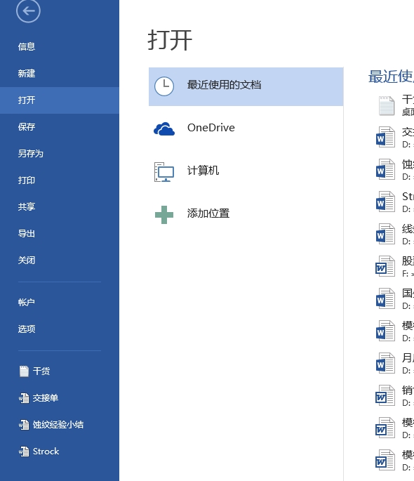 办法2:打开一个新的Word文档,点击文件-打开-最近使用的文档-也可找到刚才的文档。如果要找到所在位置,可对文档右键-将路径复制到剪贴板,然后在地址栏粘贴找到。