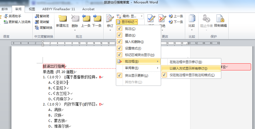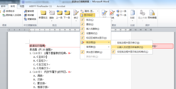 如果文档中还未显示标记 (标记:批注和修订,例如插入、删除和格式更改。在处理修订和批注时,可查看标记。打印带有标记的文档可记录对文档所做的更改。),请单击“视图”菜单上的“标记”。