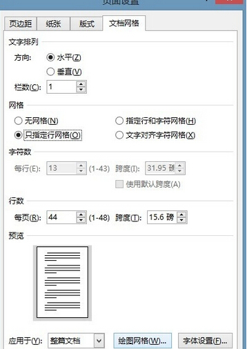 执行菜单操作“文件”→“页面设置”,弹出如下图对话框图中,首先选择“文档网格”,之后在选择“文字对齐字符网格”;最后,再点击“绘图网格”按钮进行下一步的设置。关键的一点,要选择在屏幕上显示网格下面的“垂直间隔”,之后,在右边输入间隔的数字,一般,输入1就可以了。最后点击“确定”按钮一直确认即可就这样设置,我们就可以得到如上图一样的效果了,网格线与文字,对齐得非常整齐。一个格子里面就只能输入一个字。