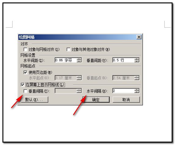 6;“水平间隔”是默认的,“垂直间隔”是要勾选后才会有;现在先不勾选“垂直间隔”; 在这个操作框中点下确定;文档中即显示出水平间隔的网格;