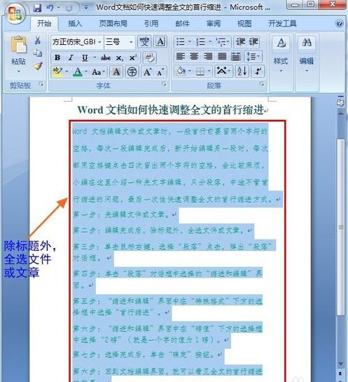 2、编辑完成后,选择需要缩进的文件或文章段落内容或者选择全文,如图所示: