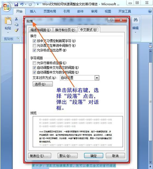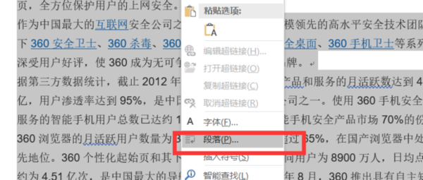 3、单击鼠标右键,选择“段落”进行点击,弹出“段落”对话框,如图所示: