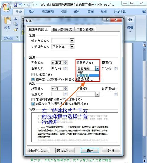 3、单击“缩进和间距”标签中的“特殊格式”框右端的下拉箭头,选择“首行缩进”;在“度量值”框中选择或输入“2字符”。