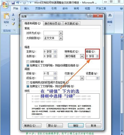 6、“缩进和编辑”界面中在“磅值”下方的选择框中选择“2字符”,如图所示: