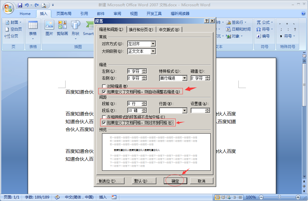 4、勾选如果“如果定义文档网络,则自动调整右缩进”和“如果定义了文档网络,则对齐到网络”,并点击“确定”。