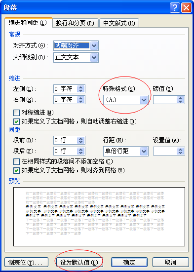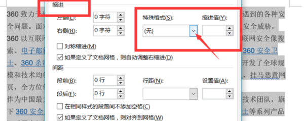 2.默认出现“缩进和间距”,选择“特殊格式”-点击V,选择“无”;