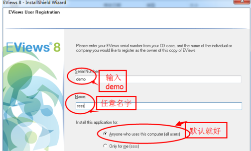 在序列号Serial Number中输入DEMO,在名字Name随便输入任何名字如ssss,然后选择下一步【Next】,继续安装。