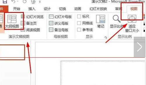 3、在PPT的空白演示文稿的最上面的工具栏中,选择“视图”,然后再点击子菜单中的顺数第二个选项,“大纲视图”。