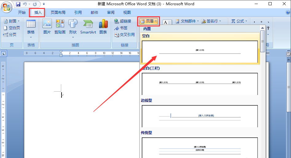 1、打开Word文档点击工具栏中的插入点击菜单选项中的【页眉】,选中一个页眉格式插入。