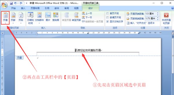 3、先双击页眉区域选中页眉,然后点击工具栏中的页眉。