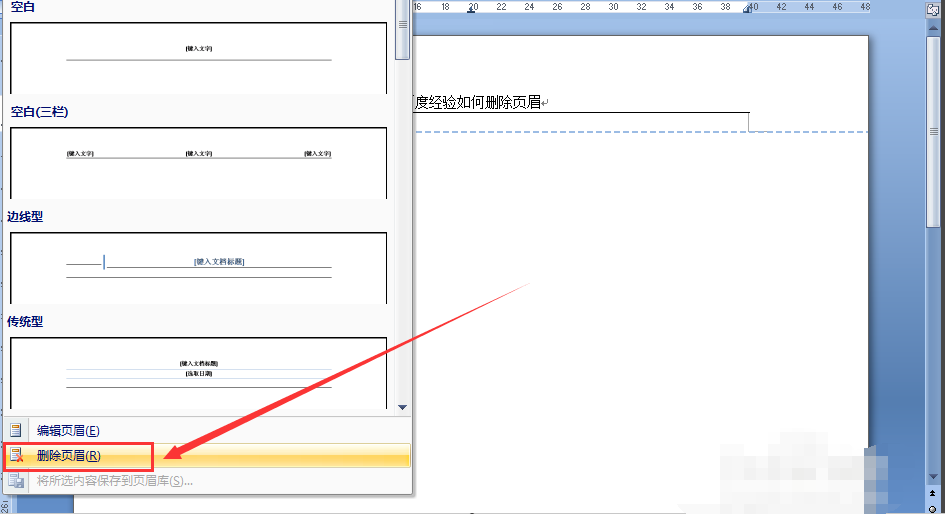 2、点击“页眉”后,此时弹出下拉菜单,在其中选择“删除页眉”,