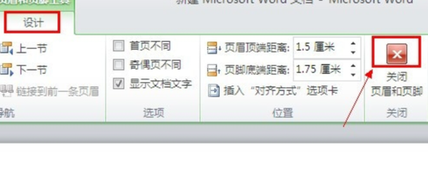 7.然后再点击菜单中”设计”功能,点击“关闭页眉和页脚”;