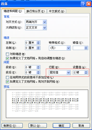 (3)弹出“段落”对话框。在“行距”下拉菜单中选中“固定值”,并将“设置值”调整为“1”,即可去掉表格后面的空白页。