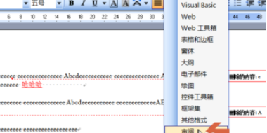 2、在word2003菜单栏右侧的空白处点击鼠标右键,点击右键菜单中的【审阅】,这样会显示审阅工具栏。