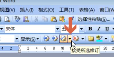 6、按以上方法只是将修订标记隐藏了,如果想彻底删除修订标记,可以点击下图所示的接受所选修订按钮右侧的小三角。