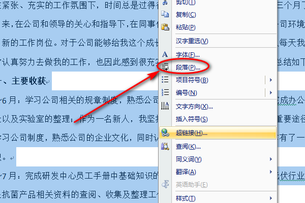 3、选中word文档全部内容后,点击鼠标右键,在出现的菜单中选择段落选项,进入段落设置界面。
