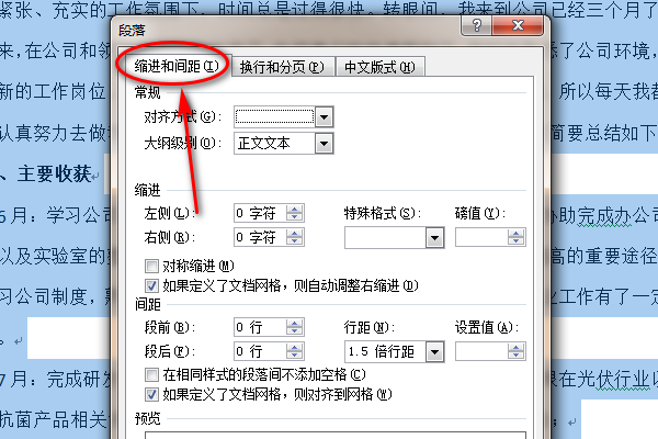 4、在段落设置界面选择缩进与间距选项,进入缩进与间距设置界面。
