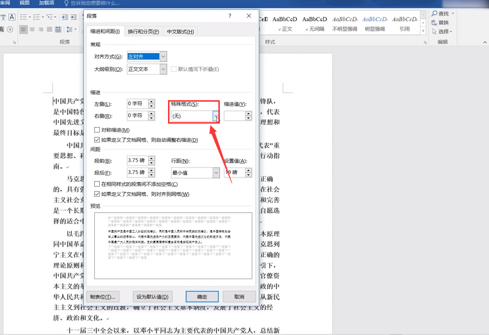 4、在“特殊格式(S)”所弹出来的下拉菜单中选择“首行缩进”;