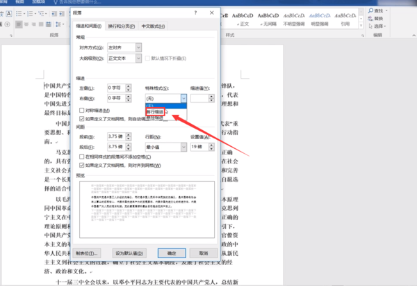 3、弹出段落对话框,在特殊格式处选择首行缩进即可,如图所示。
