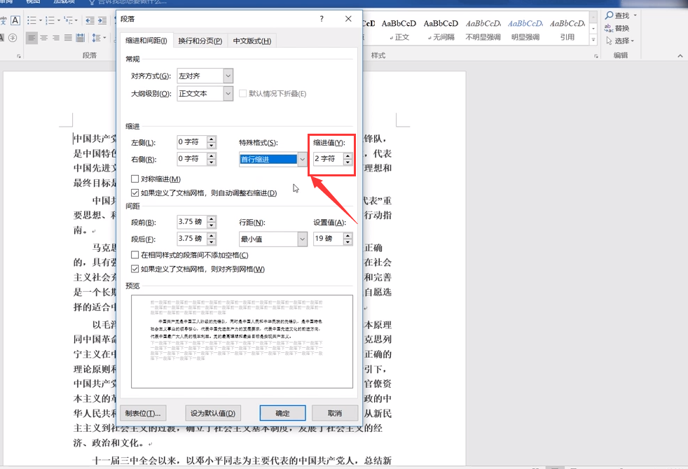 5、在界面中找到“缩进值(Y)”设置字符为“2字符”;