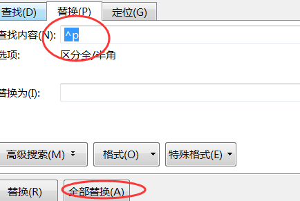 4、或者使用快捷键“Ctrl+H”调出替换对话框,在查找内容中输入“^p”,点击全部替换。