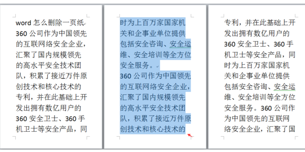 1.要删除的这一页有文字或其它内容时,则先将此页的内容全选。做法是:首先选中本页第一行开头的一个或几个字符;