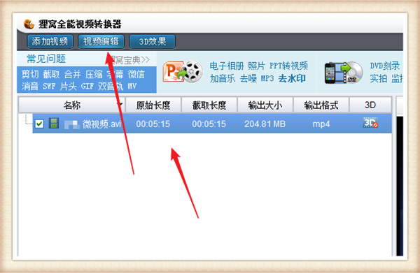 2、在电脑中点击选择视频后,点击箭头所指的“视频编辑”。