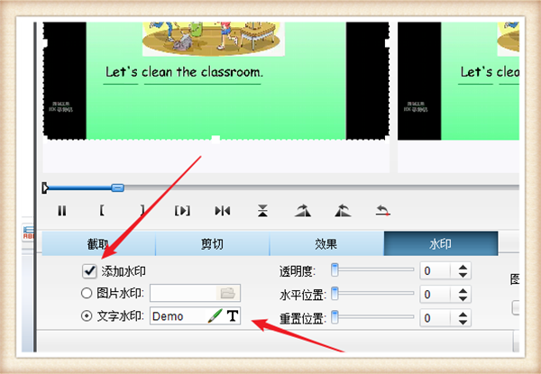 3、进入视频编辑页面后,点击箭头所指的“水印”。