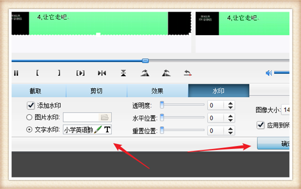 5、选择文字水印后,编辑水印的内容,然后点击箭头所指的“确定”按钮即可。