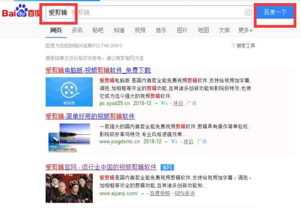 1、打开一个浏览器,在百度中输入“爱剪辑”,单击“百度一下”