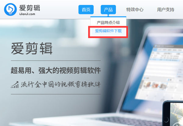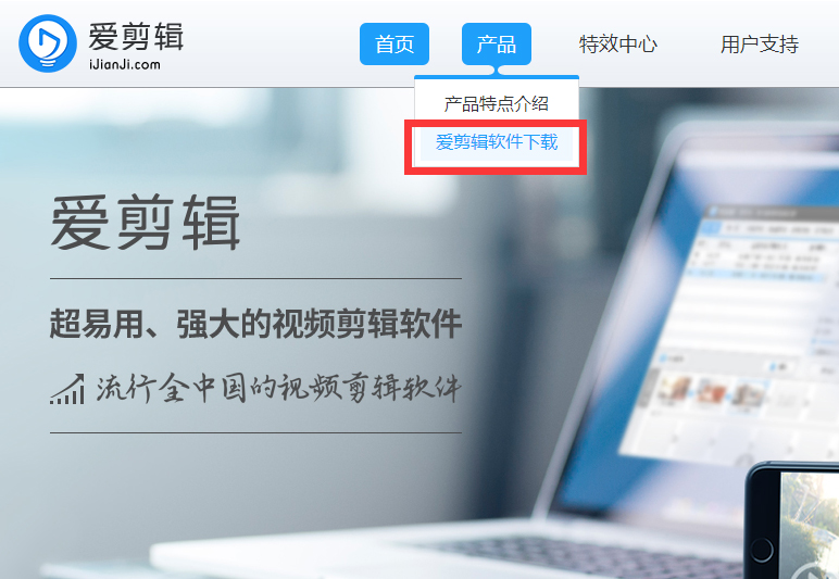 3、在打开的网页中,选择“产品”选择“爱剪辑软件下载”,进行软件的下载并且安装