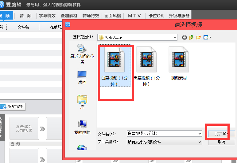 6、弹出一个对话框,选择一个视频,单击“打开”