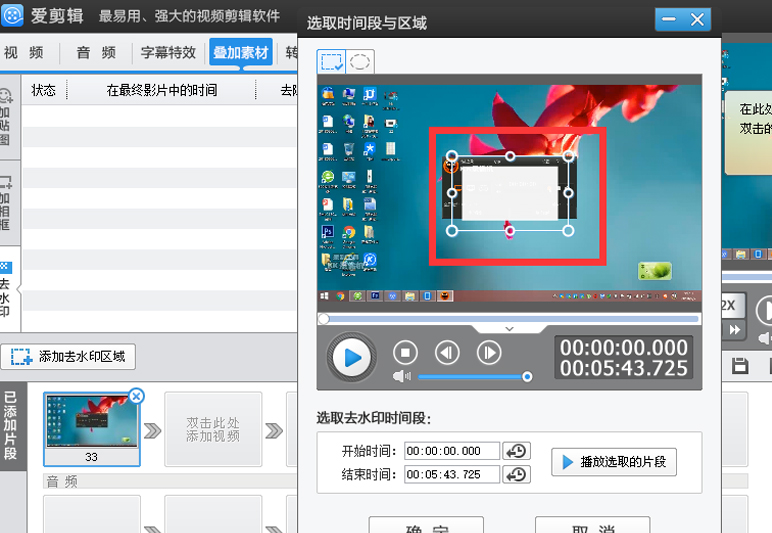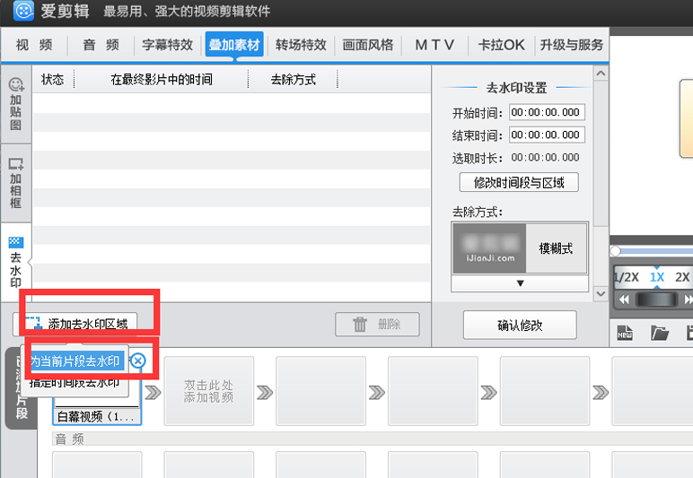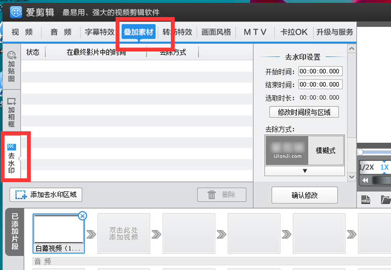1、在 叠加素材 板块选择"去水印",点击"添加去水印区域"进行选择,然后用鼠标拖到你要的位置就好啦,还可以选择去水印的形状、方式、柔化边框等等,很方便,都在一个界面完成