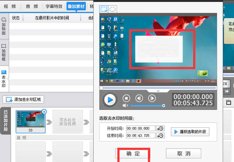 9、单击“添加去水印区域”,然后选择“为当前片段去水印”