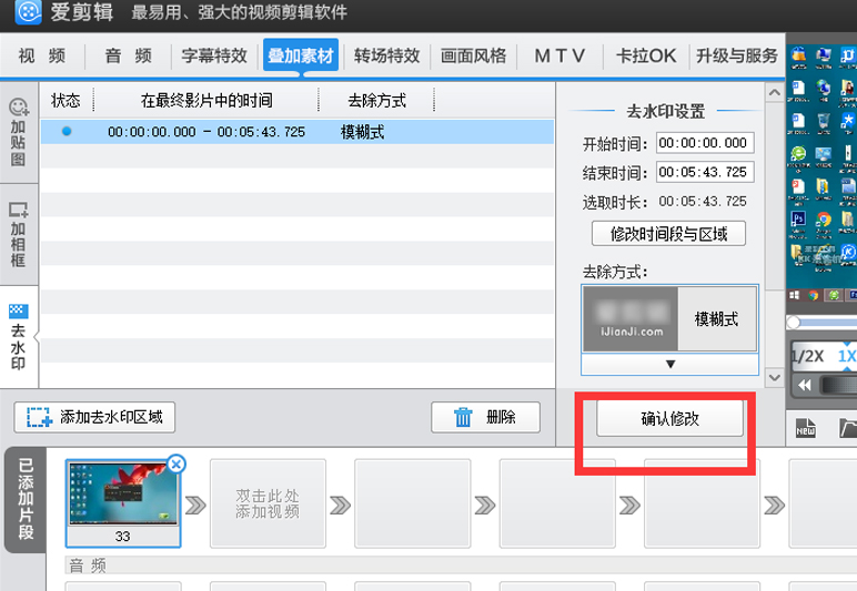 8、单击“叠加素材”菜单,然后选择“去水印”选项
