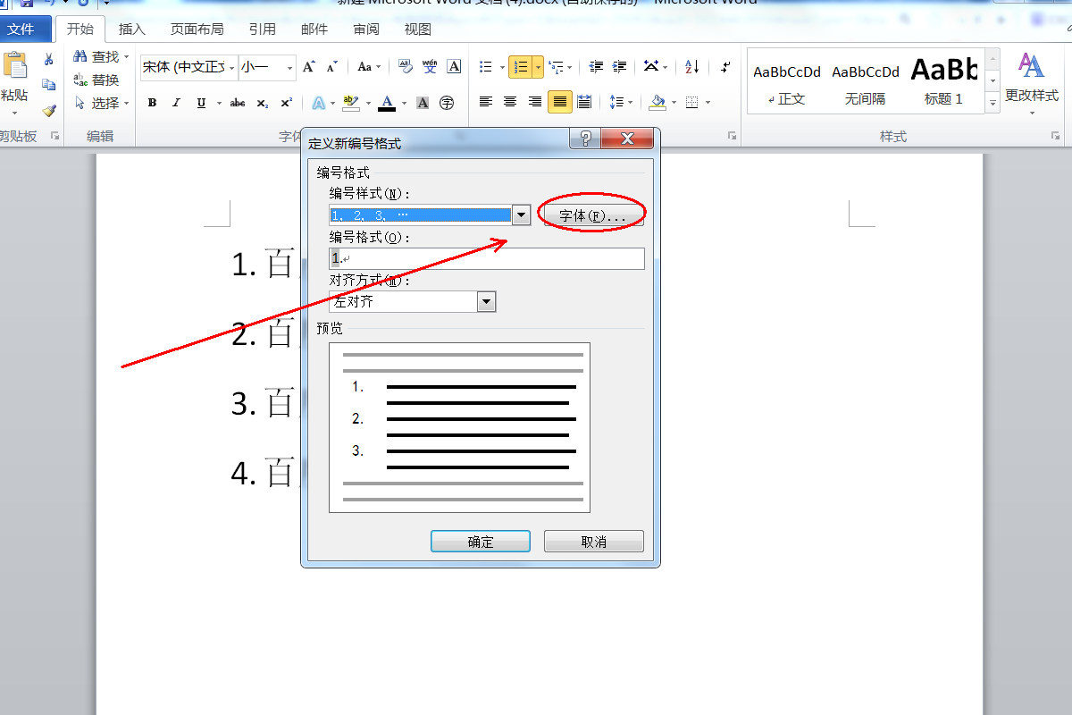5、弹出定义新编号格式对话框,单击字体按钮;