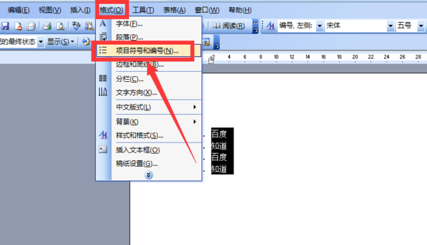 打开word文档,选中编号内容,点击”格式“后,再点击”项目符号和编号“;