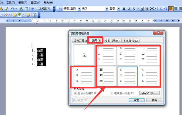 4、完成上一步之后,选择一种自己喜欢的一种编号样式。