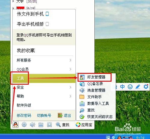 2、在左下角主菜单中选择工具,然后在工具中选择好友管理器。