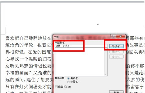 第2步,打开“书签”对话框,在“书签名”编辑框中输入书签名称(书签名只能包含字母和数字,不能包含符号和空格),并单击“添加”按钮即可,如图所示。