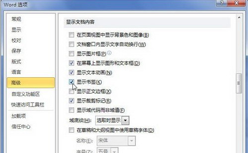 第2步,打开“Word选项”对话框,切换到“高级”选项卡。在“显示文档内容”区域取消或选中“显示书签”复选框,并单击“确定”按钮,如图所示。