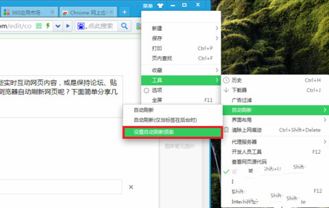 第一步:安装有某安全浏览器,点击菜单,打开工具下的自动刷新,点击设置自定刷新频率;