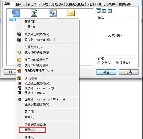 2、在打开的对话框中,右键单击”空白文档“模版,点”删除“,并确定。运行Word即可解决问题。