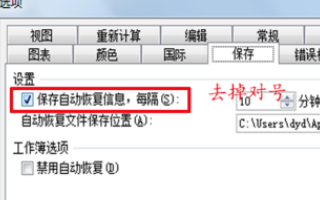 3、在选项这个页面内找到保存,把保存自动恢复信息前面的对号去掉,关闭excel重新启动程序。
