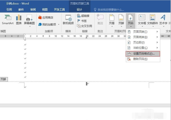 4、单击页眉和页脚工具设计----->页码----->设置页码格式;