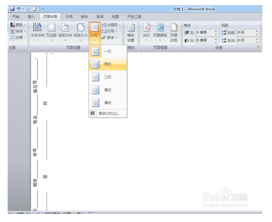 1、首先对试卷进行分栏,在"页面布局"中,点击"分栏"。这里按一般的试卷格式,将其分为两栏