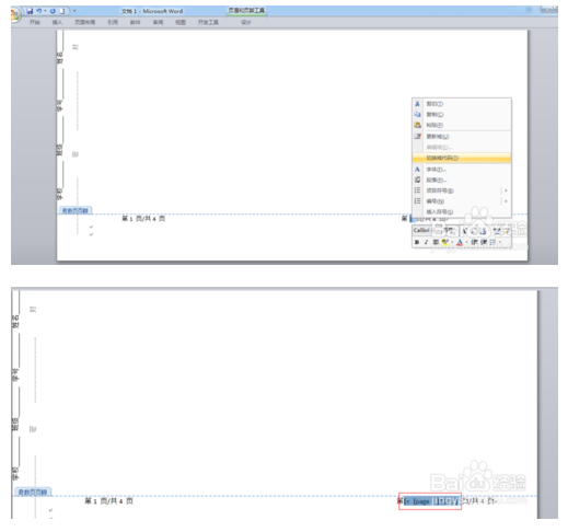 10、接着编辑第二栏页码,因为总页码数是不变的,所以不需重新编辑,但当前页码是不一样的,所以需要编辑当前页码。如下所示,单击当前页码数,选择"切换域代码",将出现其域。