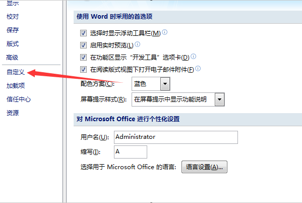 4、在进入Word选项后点击自定义选项,打开自定义设置界面。
